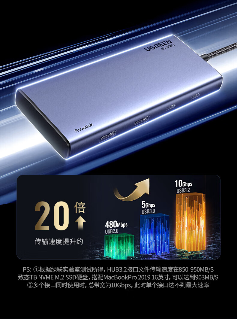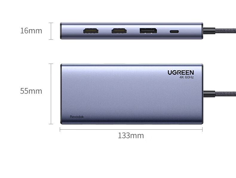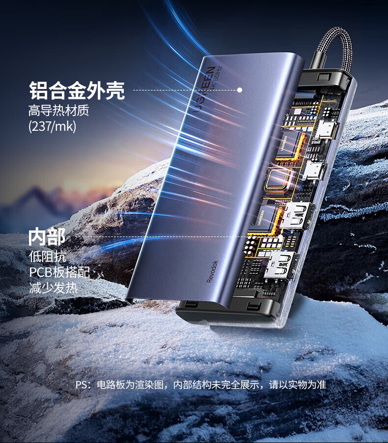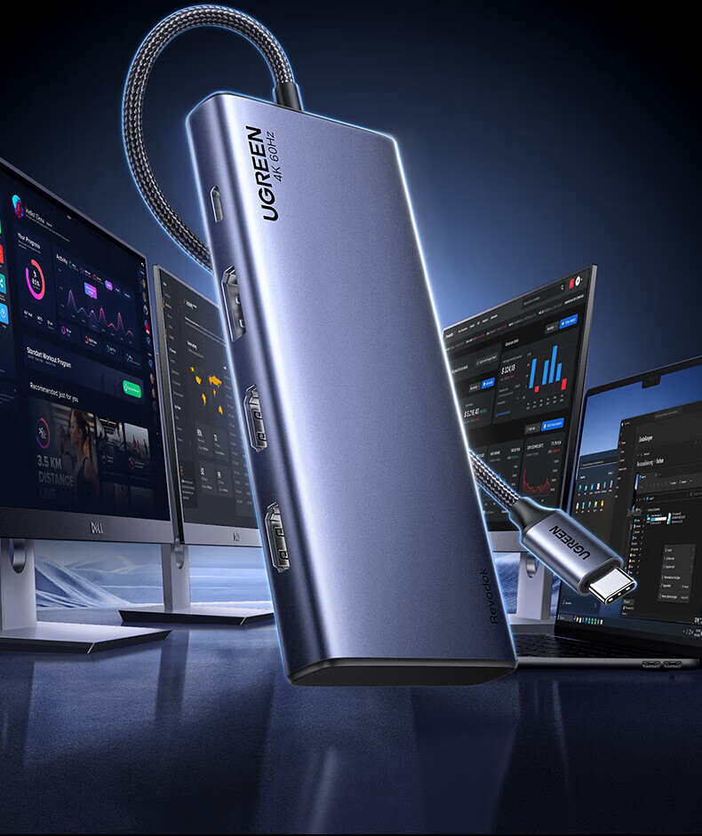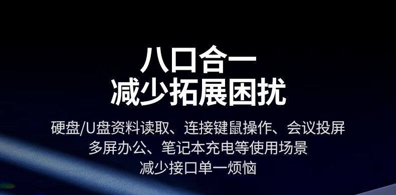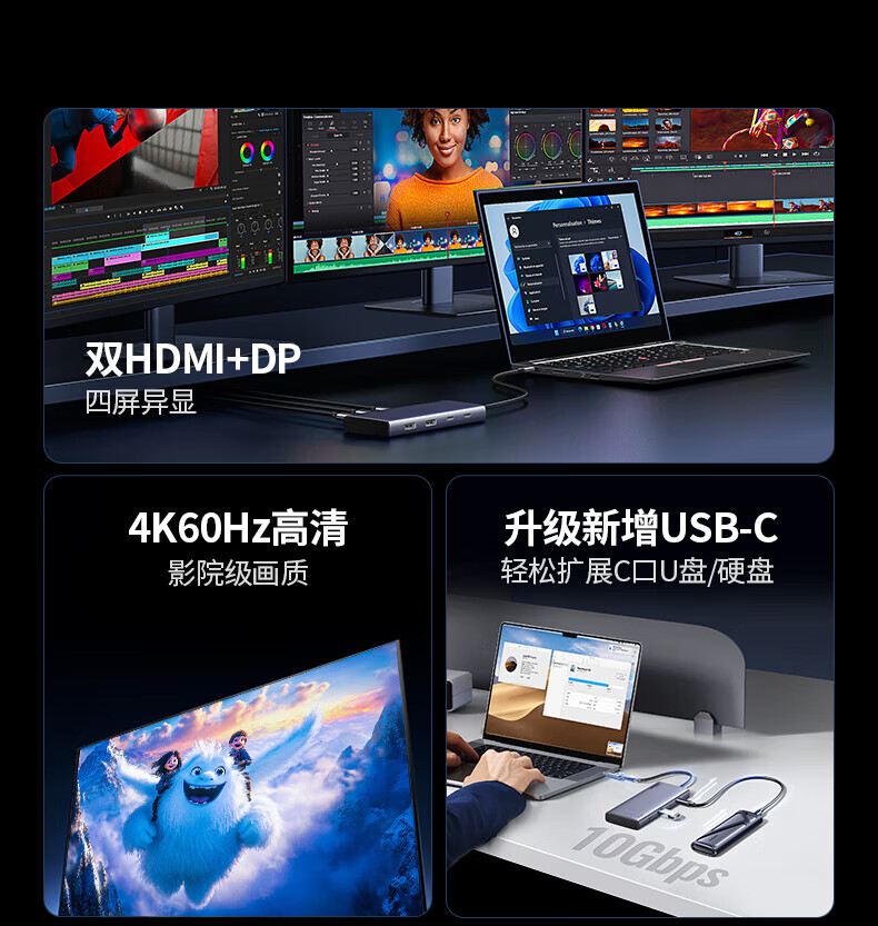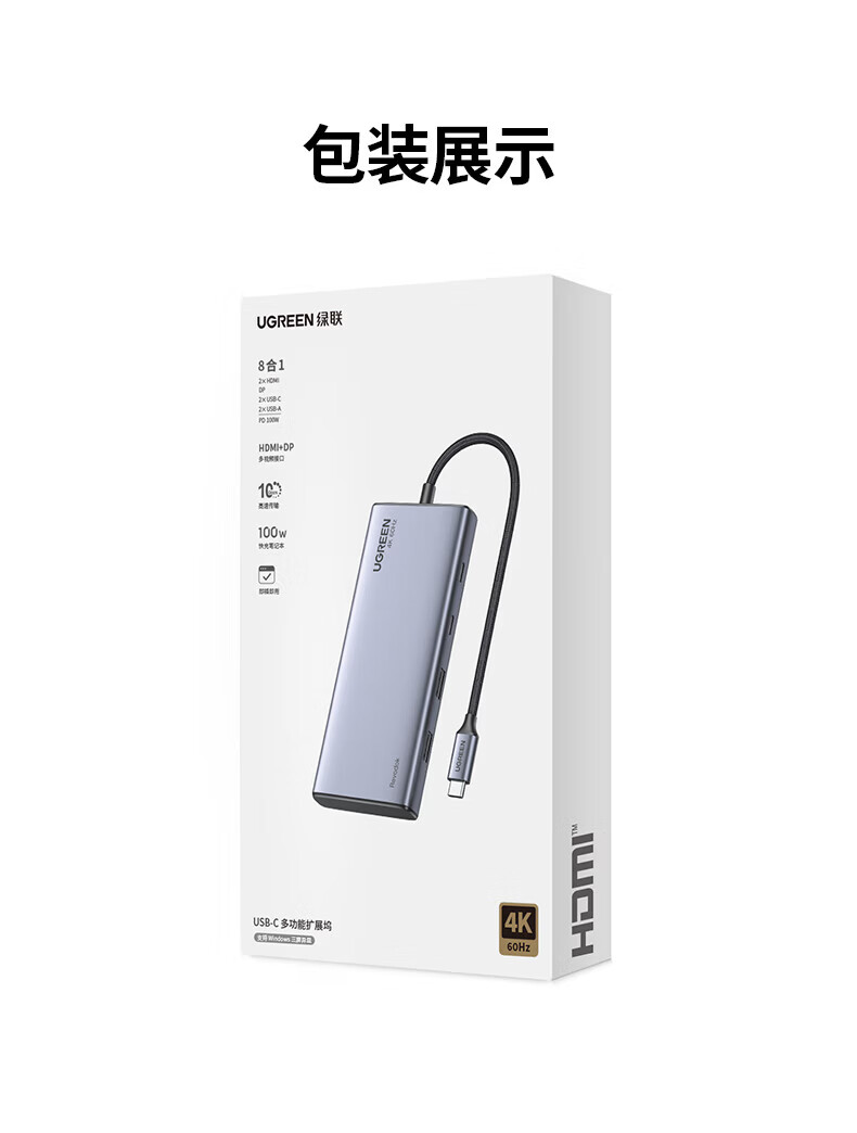 绿联(UGREEN)Type-C3.2双HDMI/DP八合一8合1扩展坞USB-C雷电5拓展坞10G转接4K60Hz多屏扩展适用联想华为电脑MST 8合一音频款CM880-55544