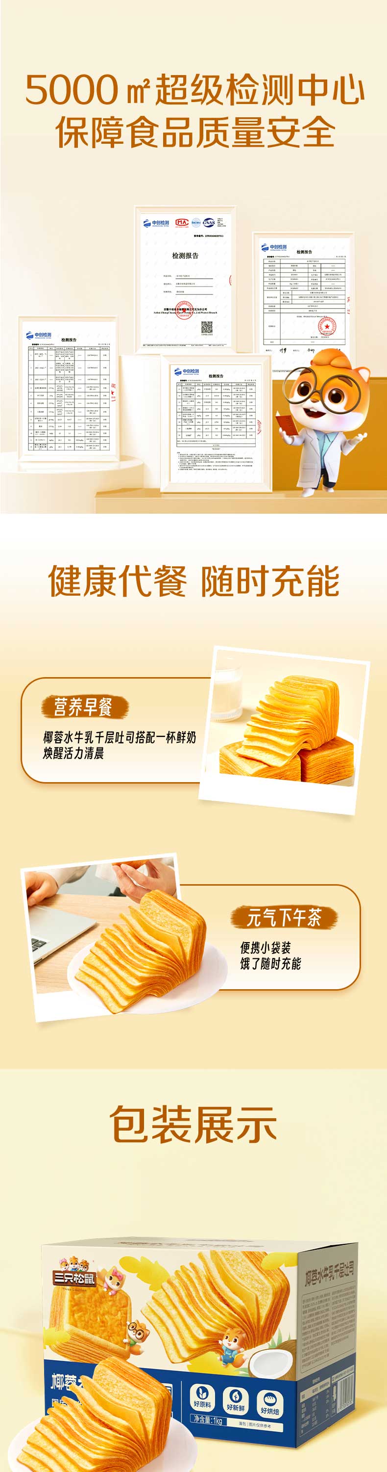 三只松鼠椰蓉水牛乳千层吐司1kg 早餐厚切手撕面包小蛋糕饱腹代餐糕点点心