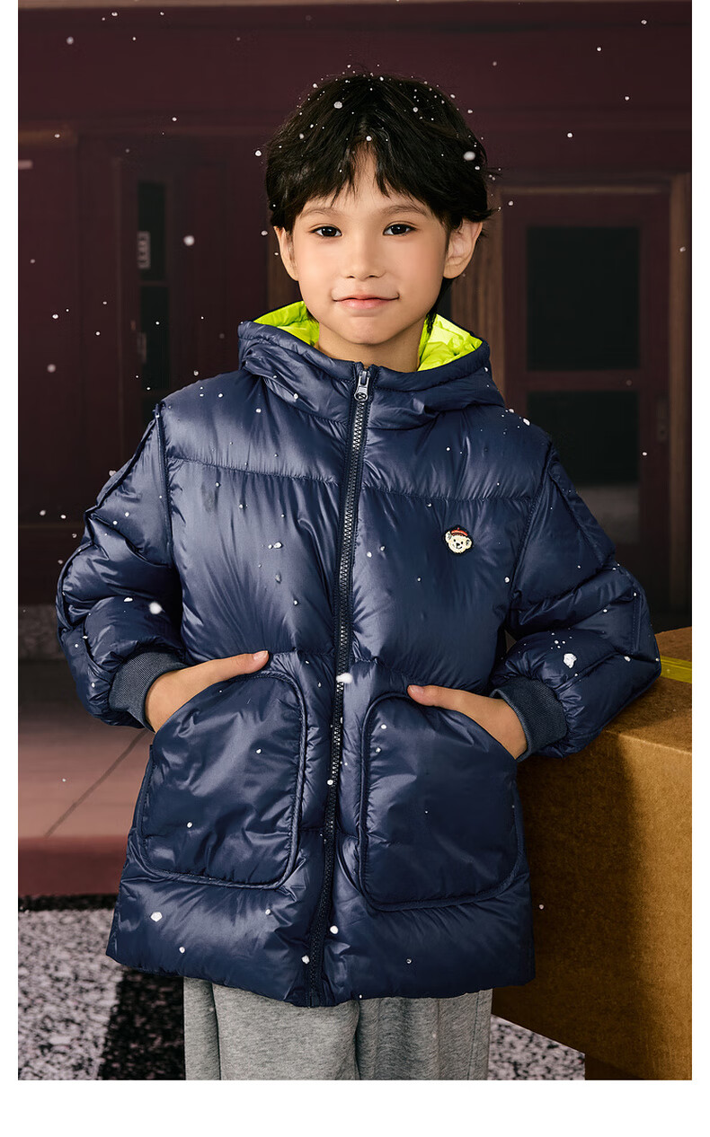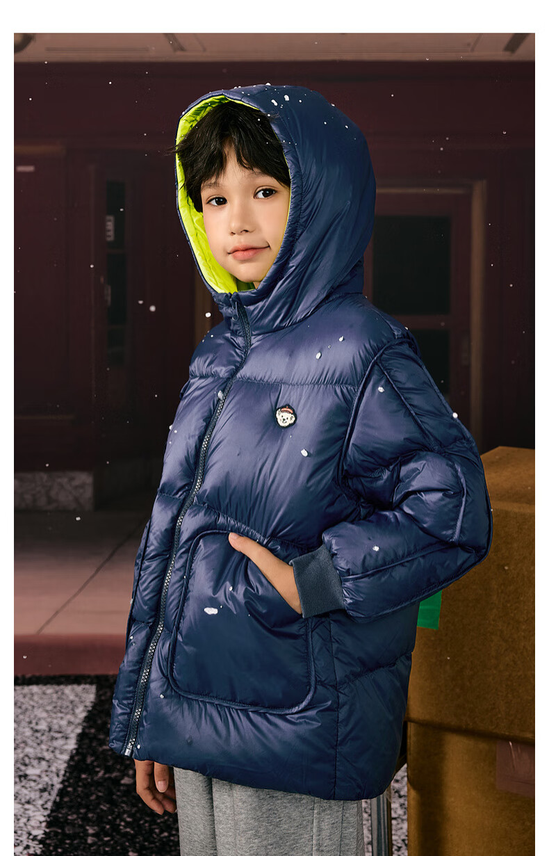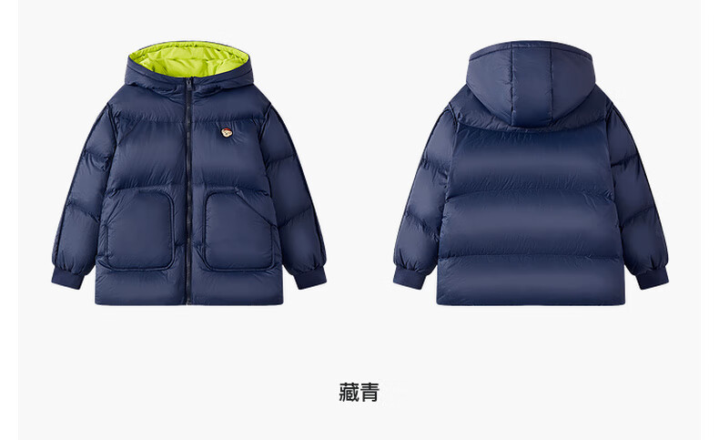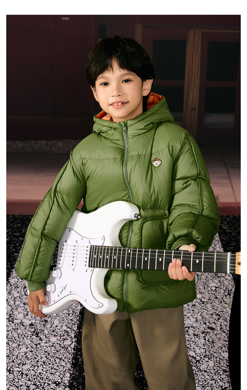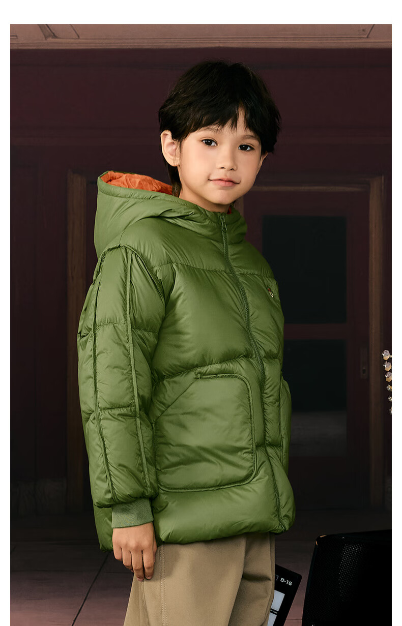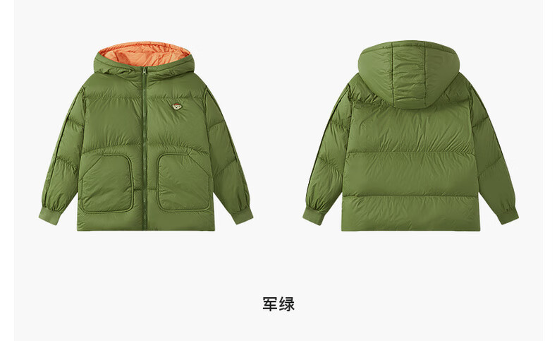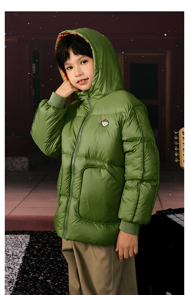 马骑顿男大童冬季新品学院风潮酷休闲保暖连帽羽绒服中长款 军绿 140 充绒量87g