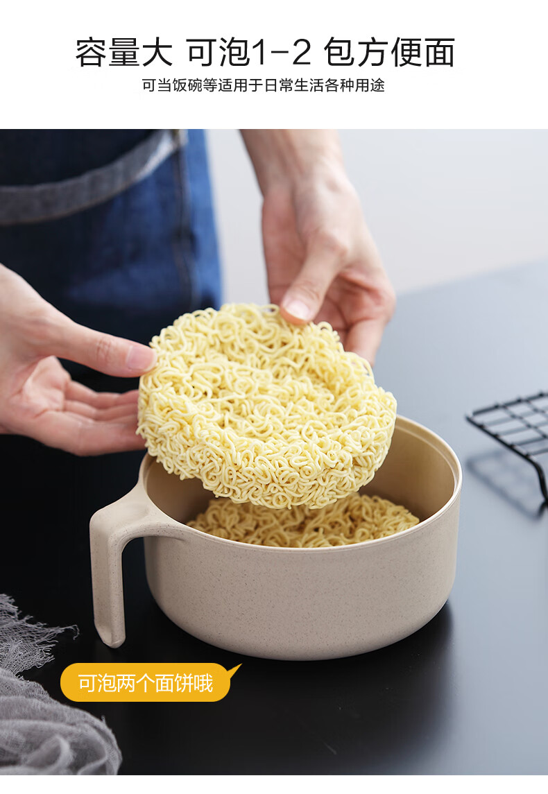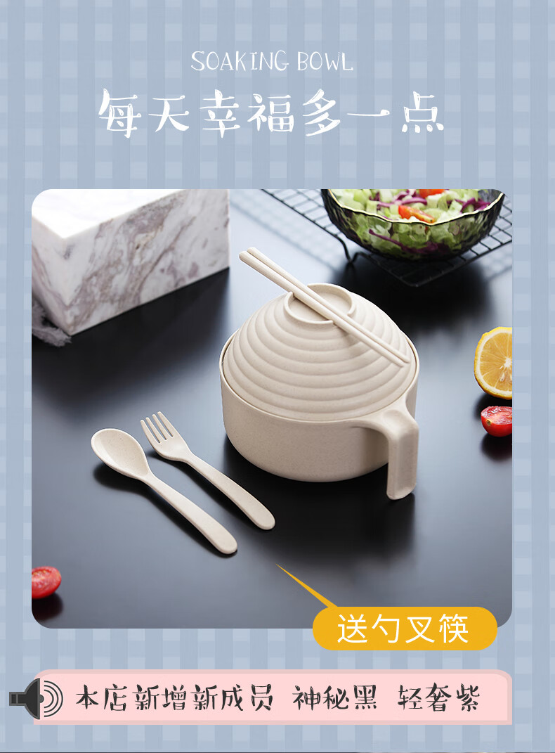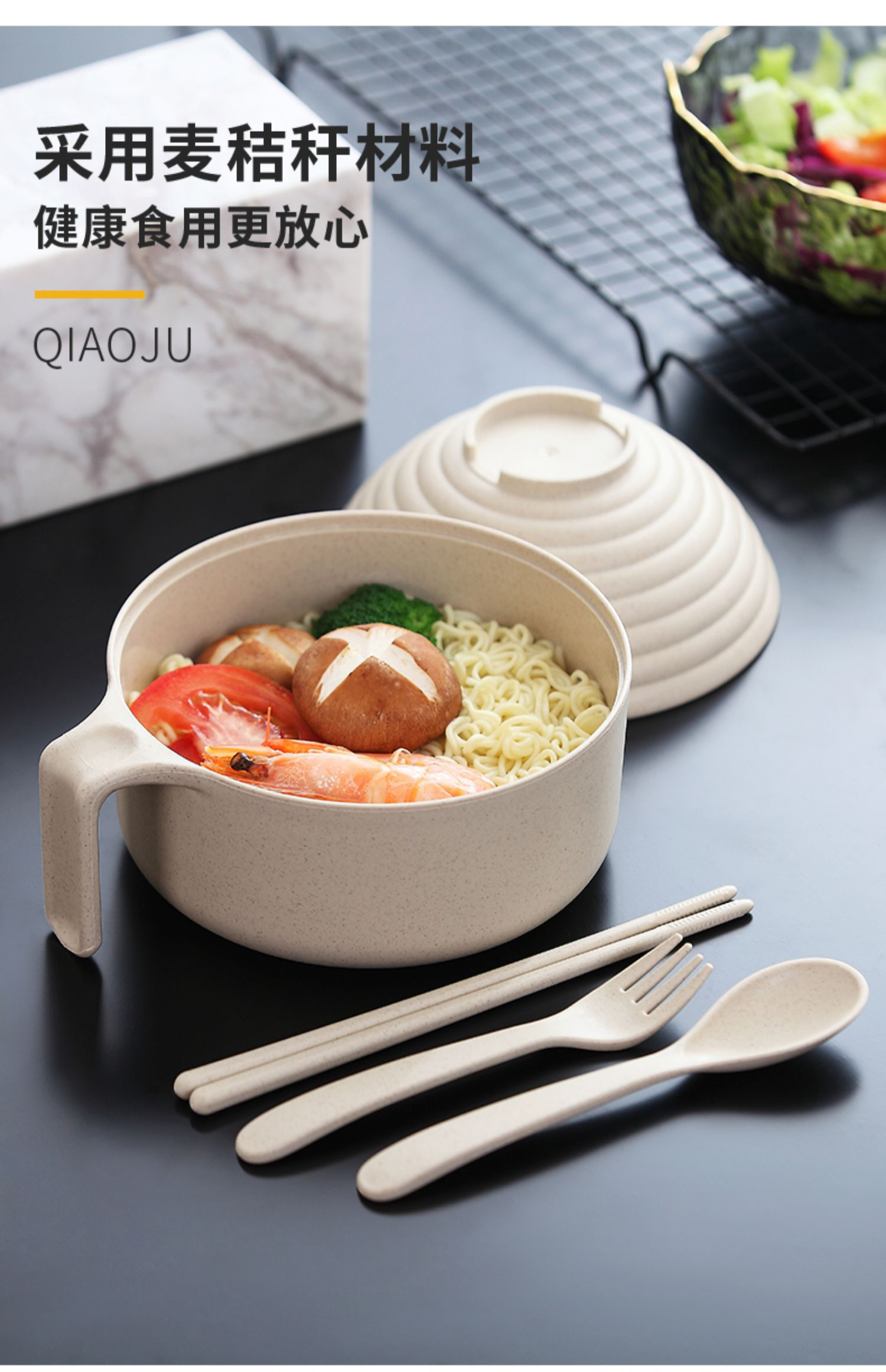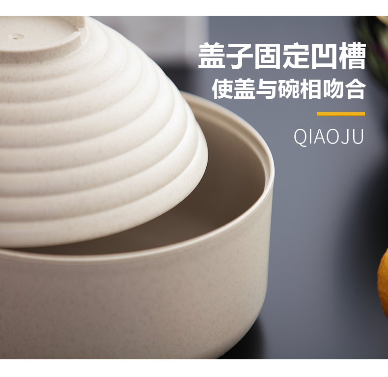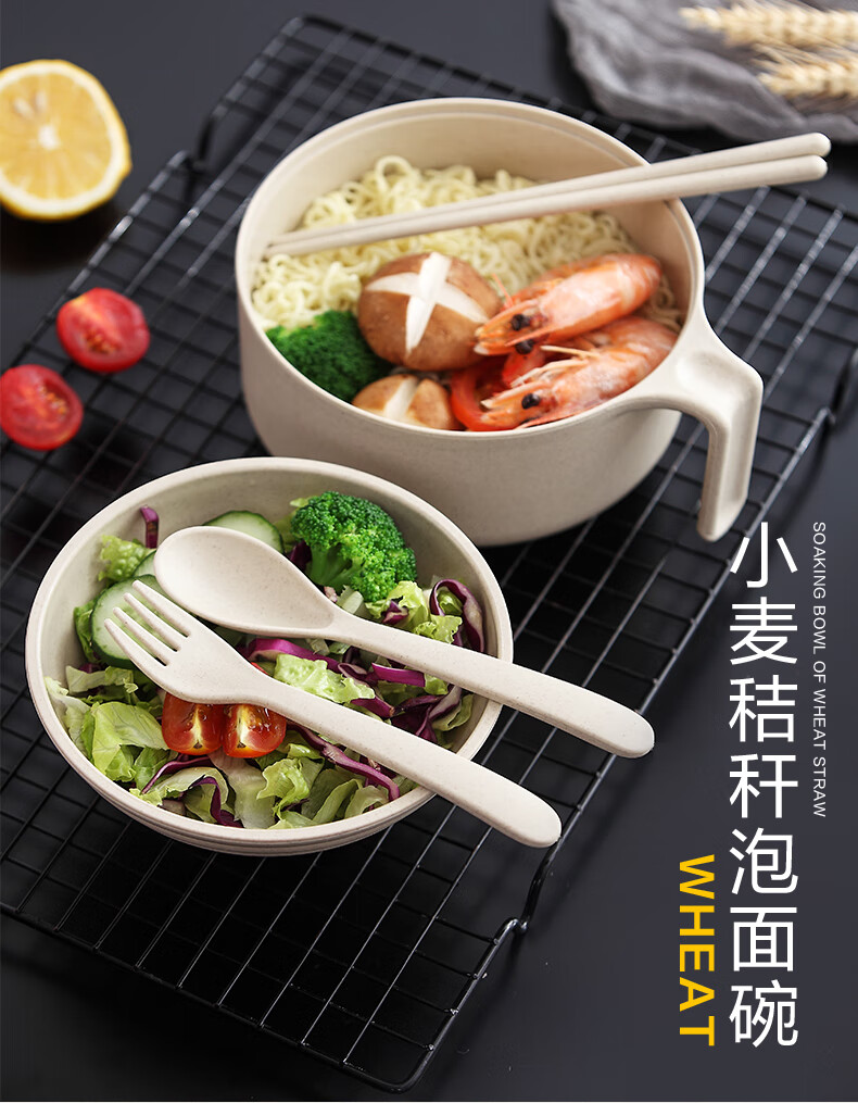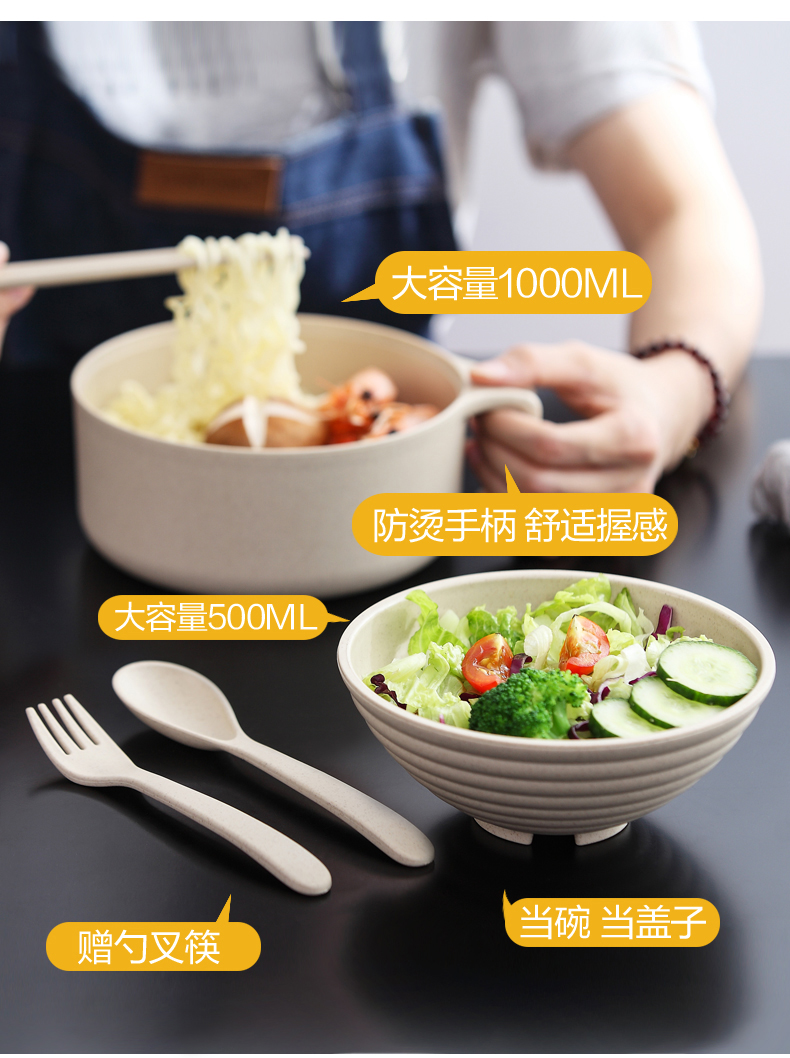 巧居巧具小麦秸秆餐具泡面碗带盖饭碗个人专用碗具套装汤碗大号碗筷家用 【薄荷绿】5件套