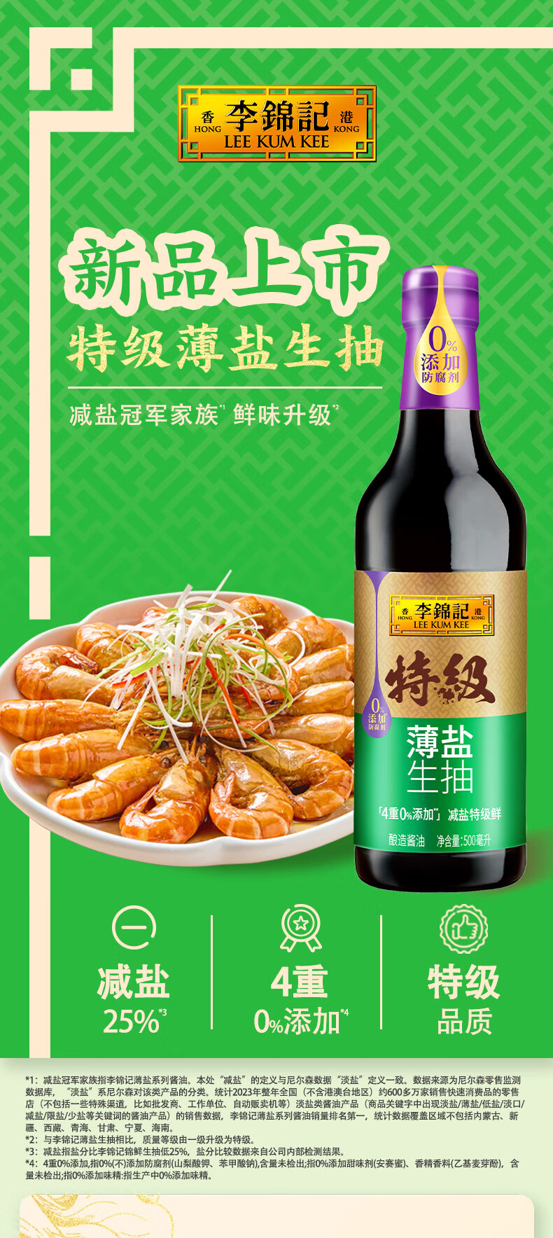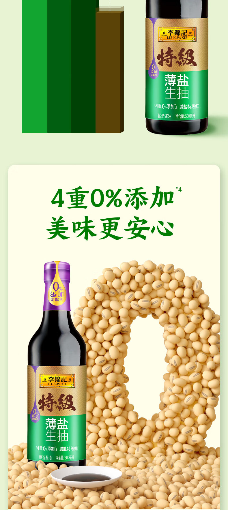 李锦记 特级薄盐生抽500ml 健康薄盐 美味更安心 减盐特级鲜 酱油 生抽