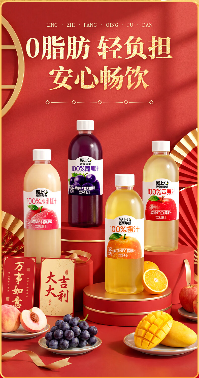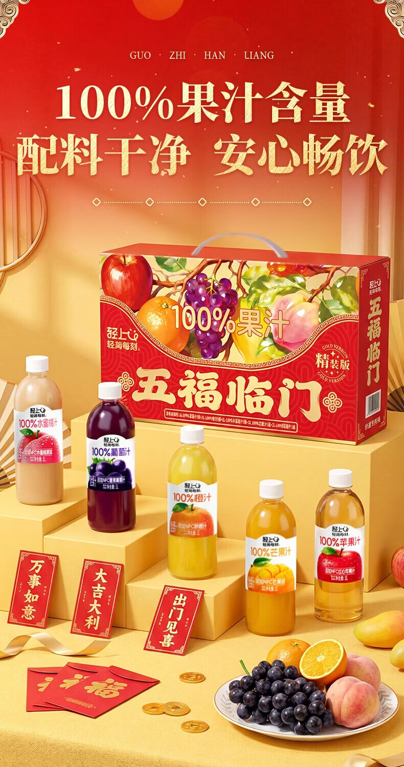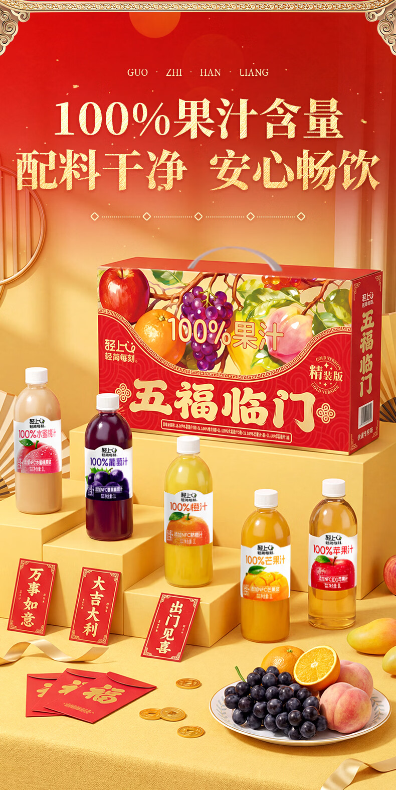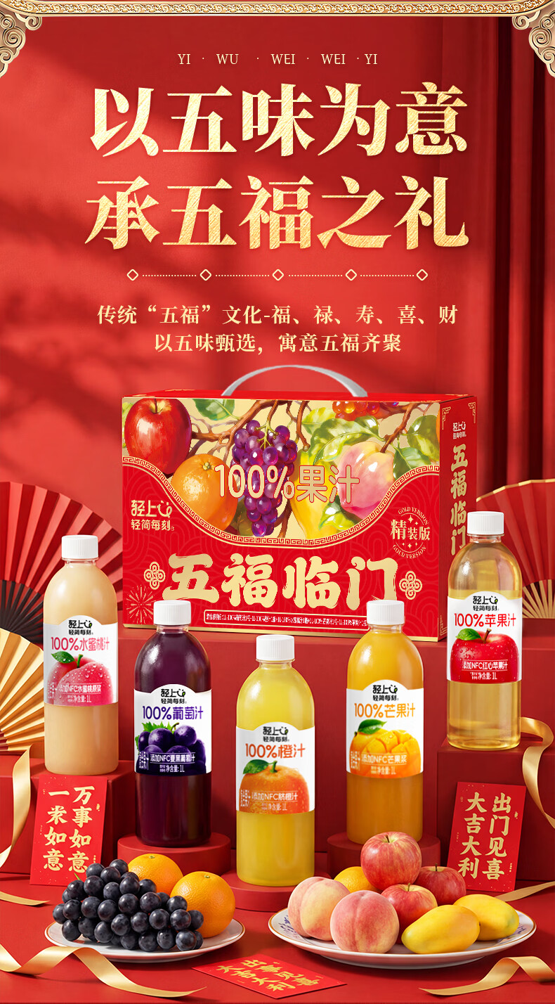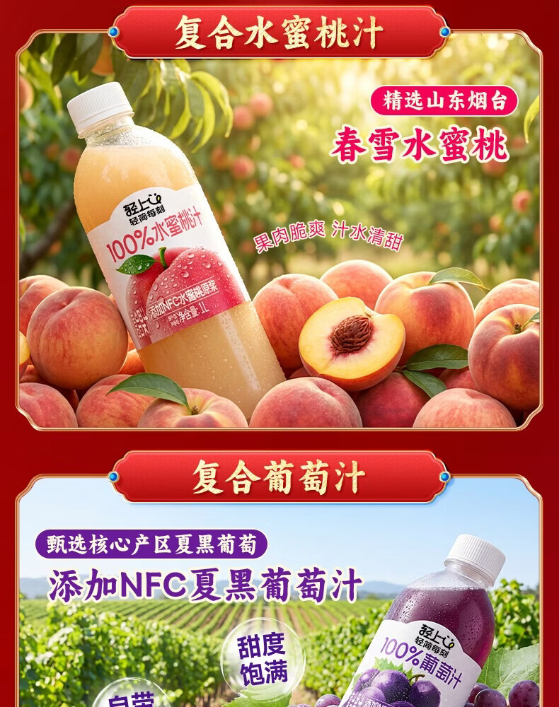 轻上【年货送礼】轻颜红石榴桑葚汁车厘子双莓汁富含维C酸甜可口整箱 红石榴桑椹汁1L*2瓶+车厘子双莓汁1L*2