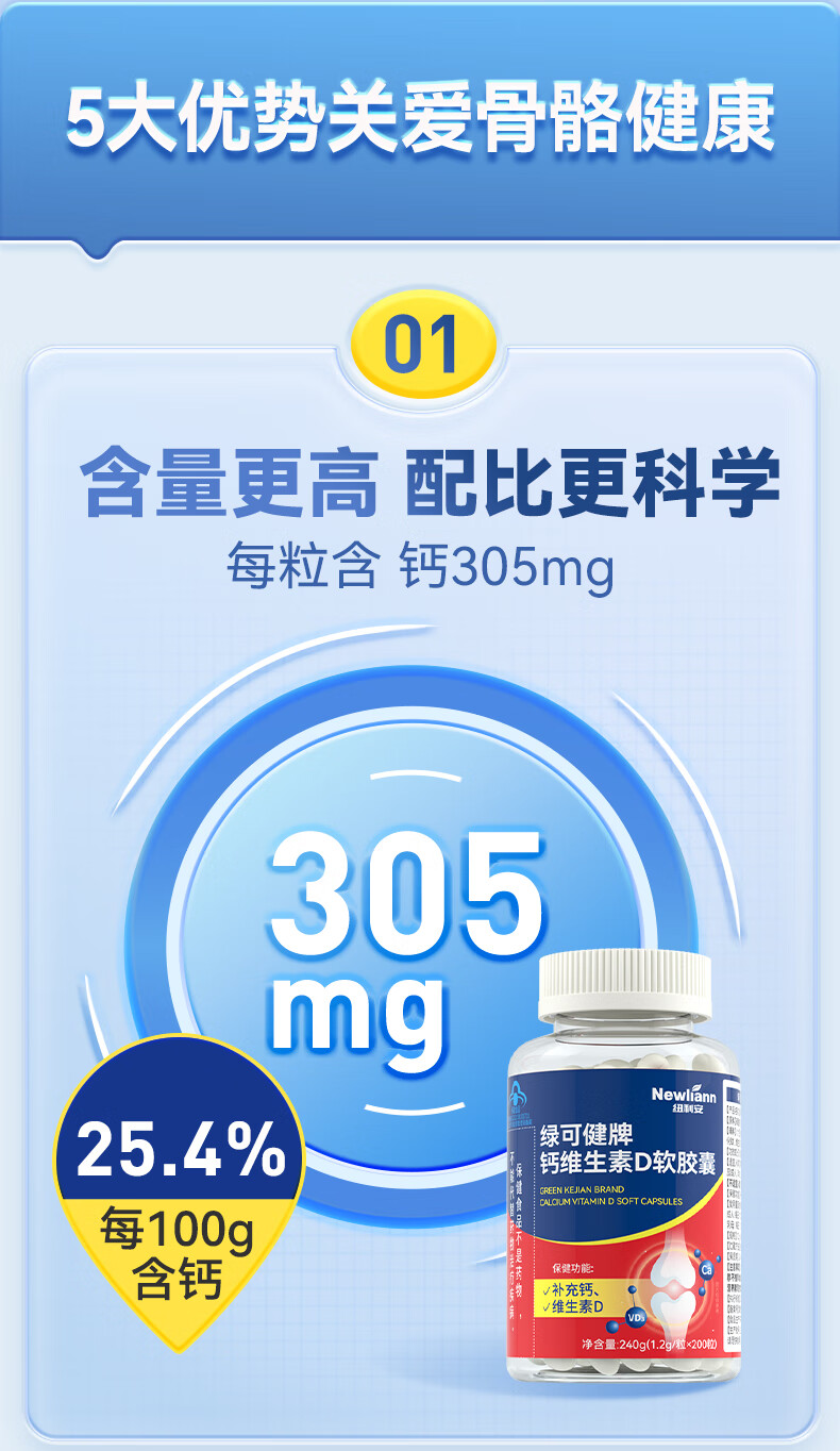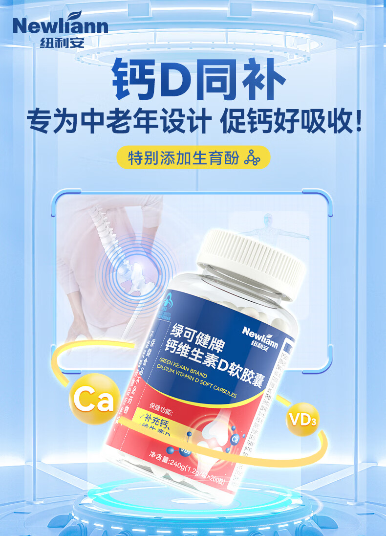Newliann钙维生素d 钙D软胶囊 成人中老年人液体钙片 补钙 1.2g/粒*200粒
