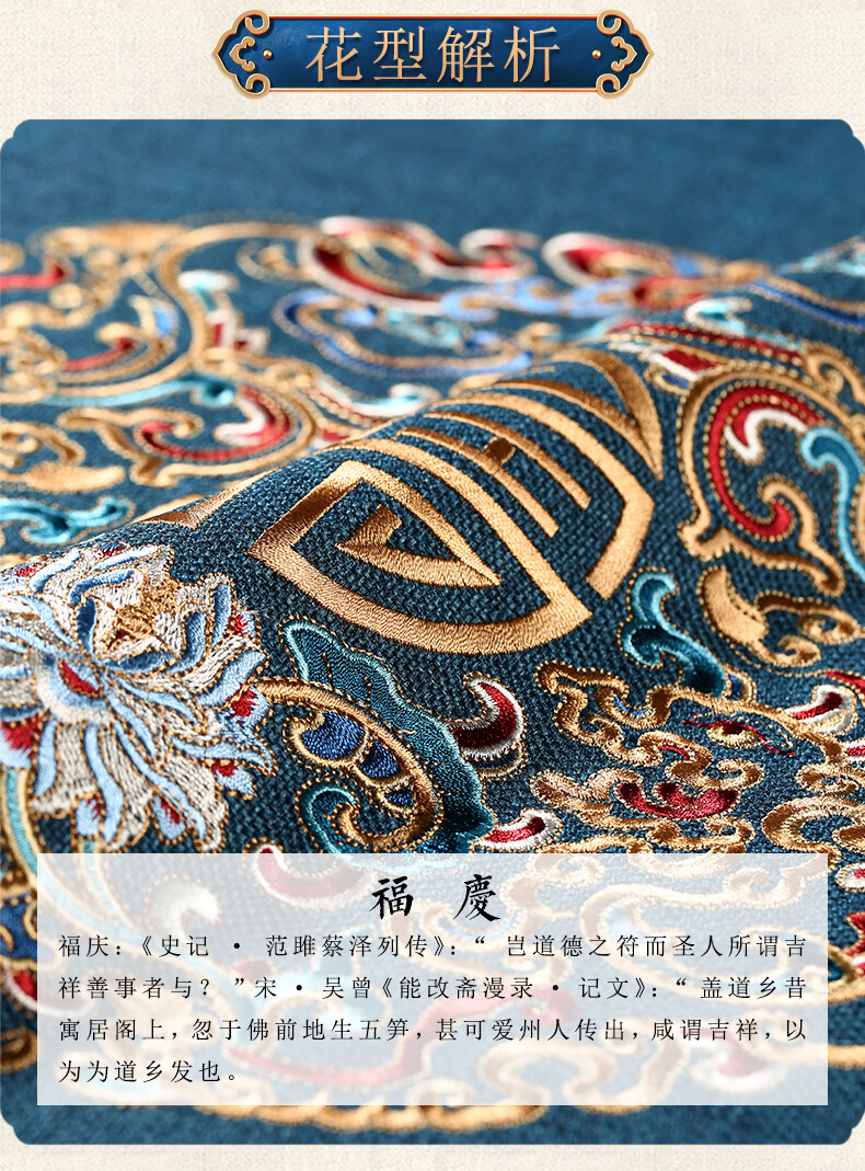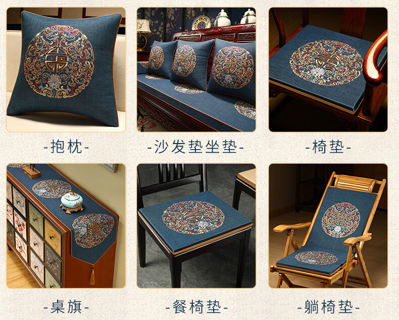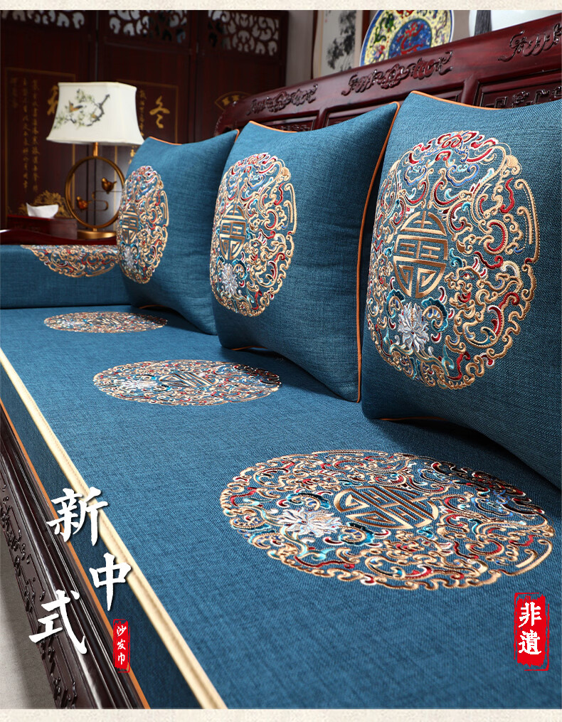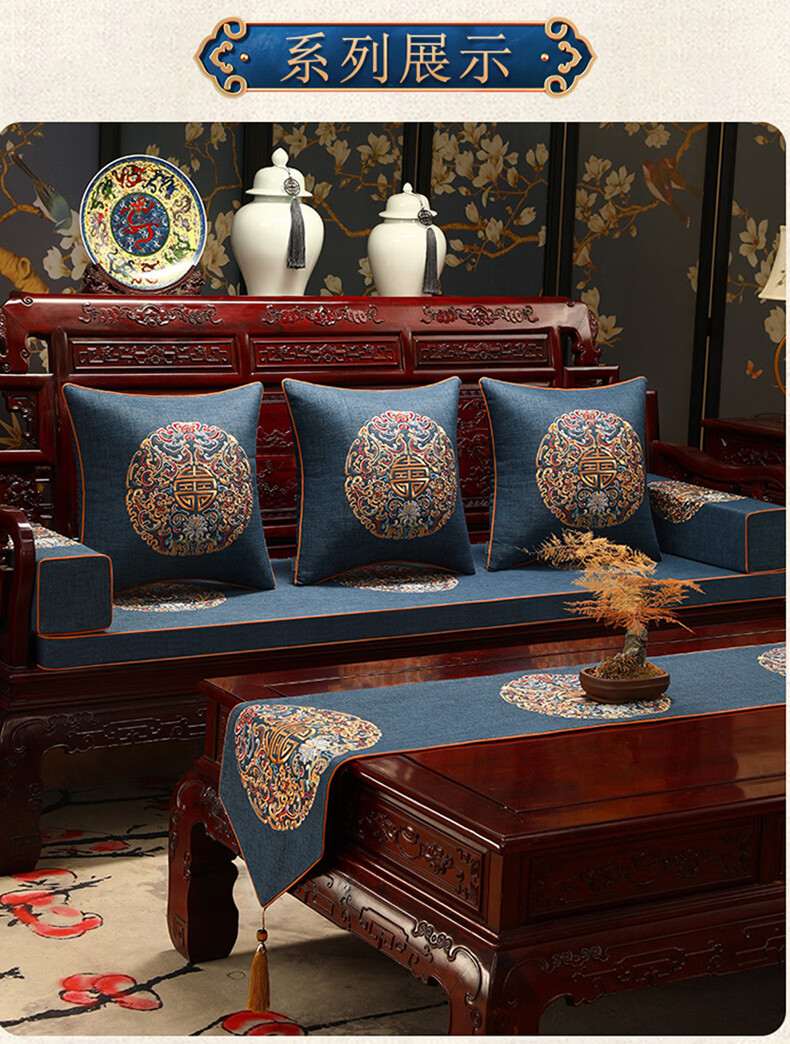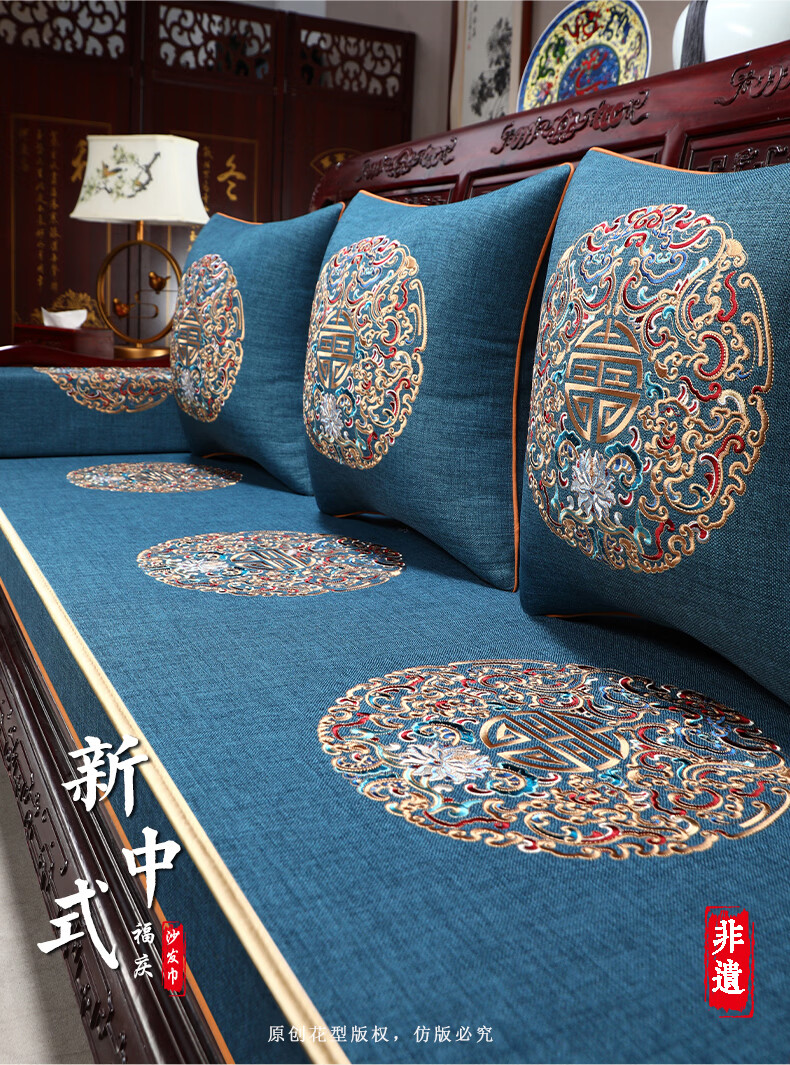 大唐梦新中式红木沙发盖布座垫套罩靠背巾全盖定制高级感防滑直排沙发巾 福庆 深蓝【多丽丝麻/刺绣/防水/防滑】 60cm*60cm【单人坐垫/靠背巾/扶手巾】不含内芯