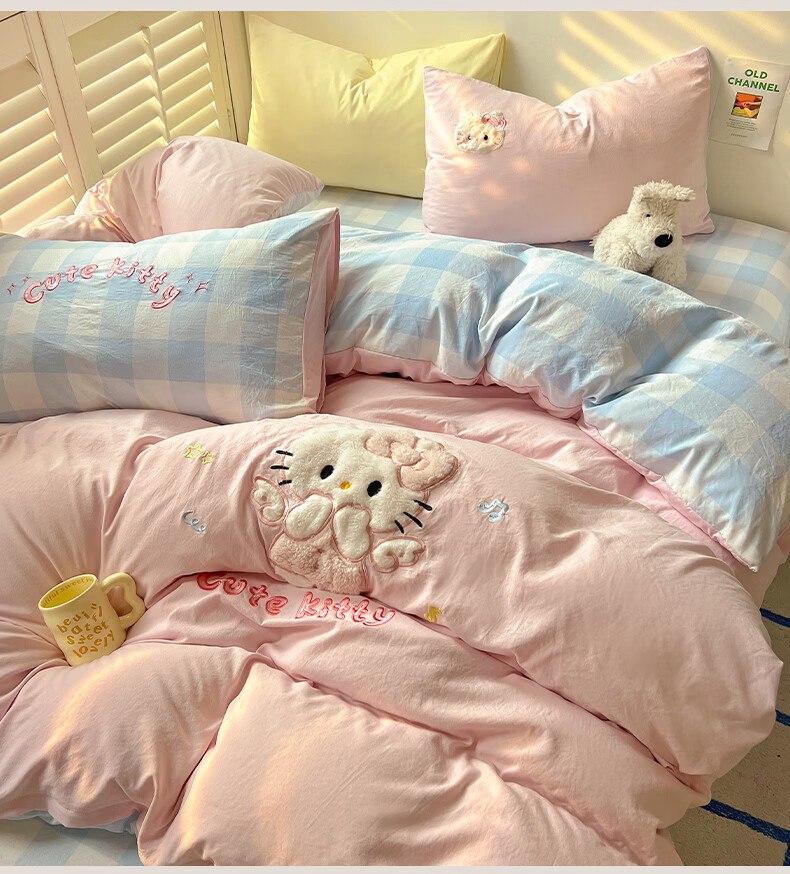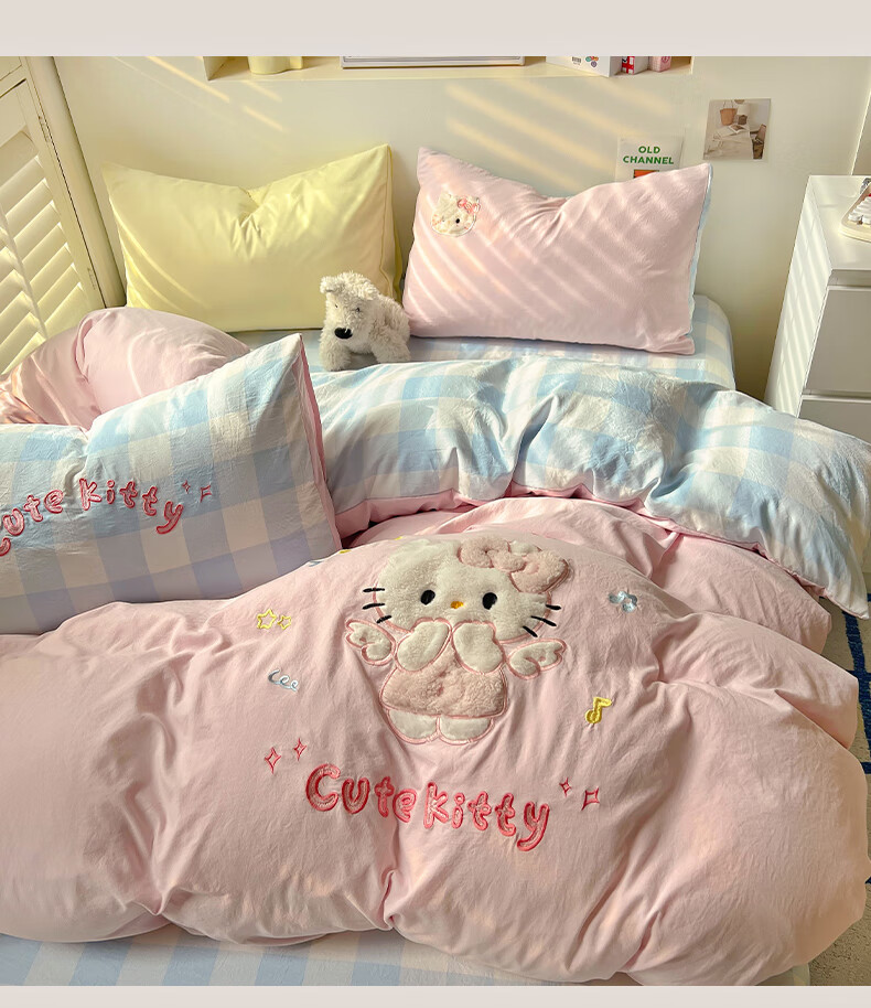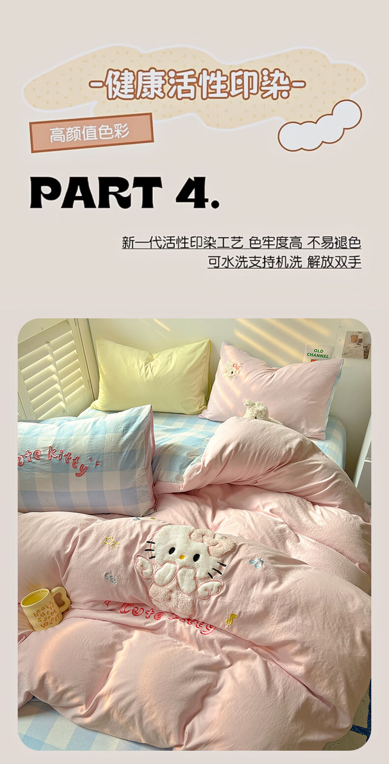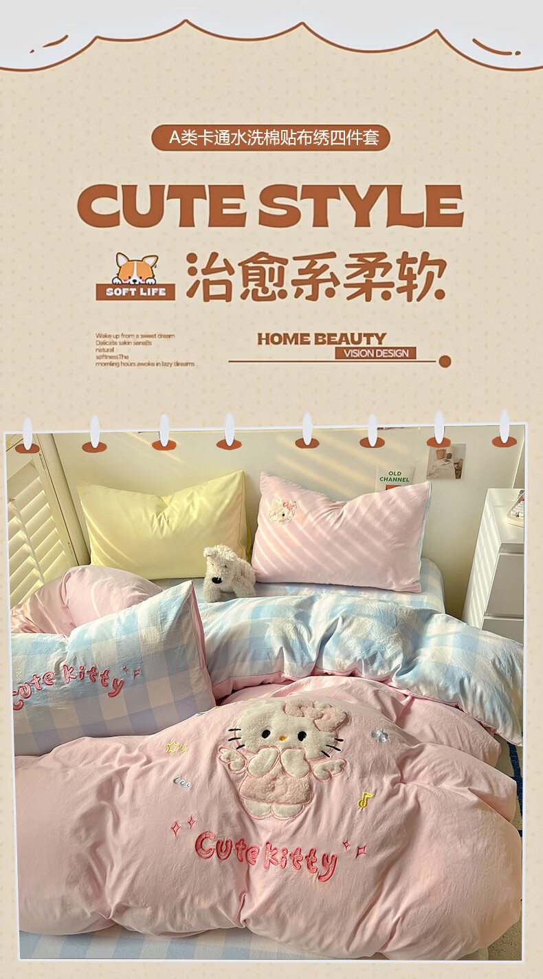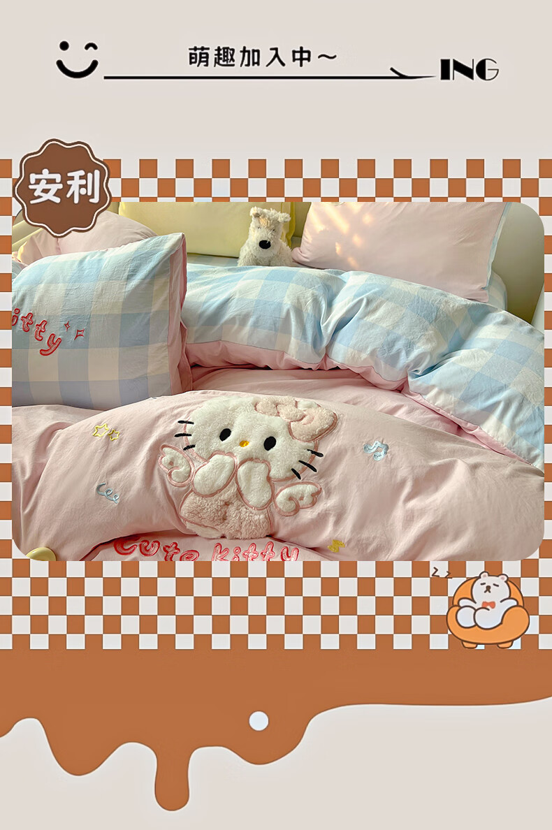 VJEA类可爱水洗棉贴布绣四件套公主风卡通床单被套学生宿舍三件套 天使喵喵-芭蕾粉+海岛蓝格 三件套0.9m 床单款 (被套150*200cm)