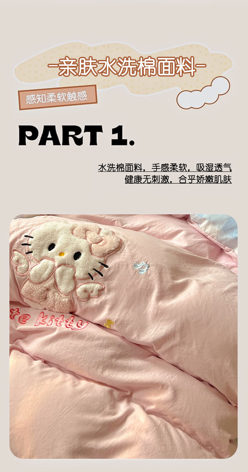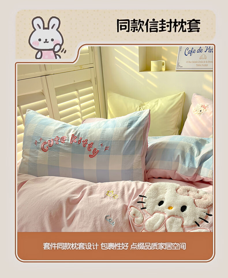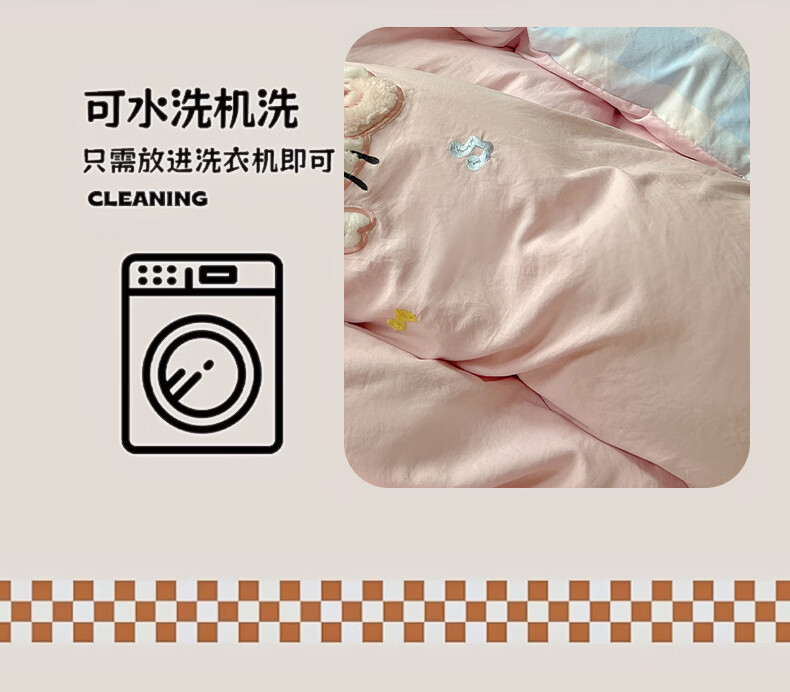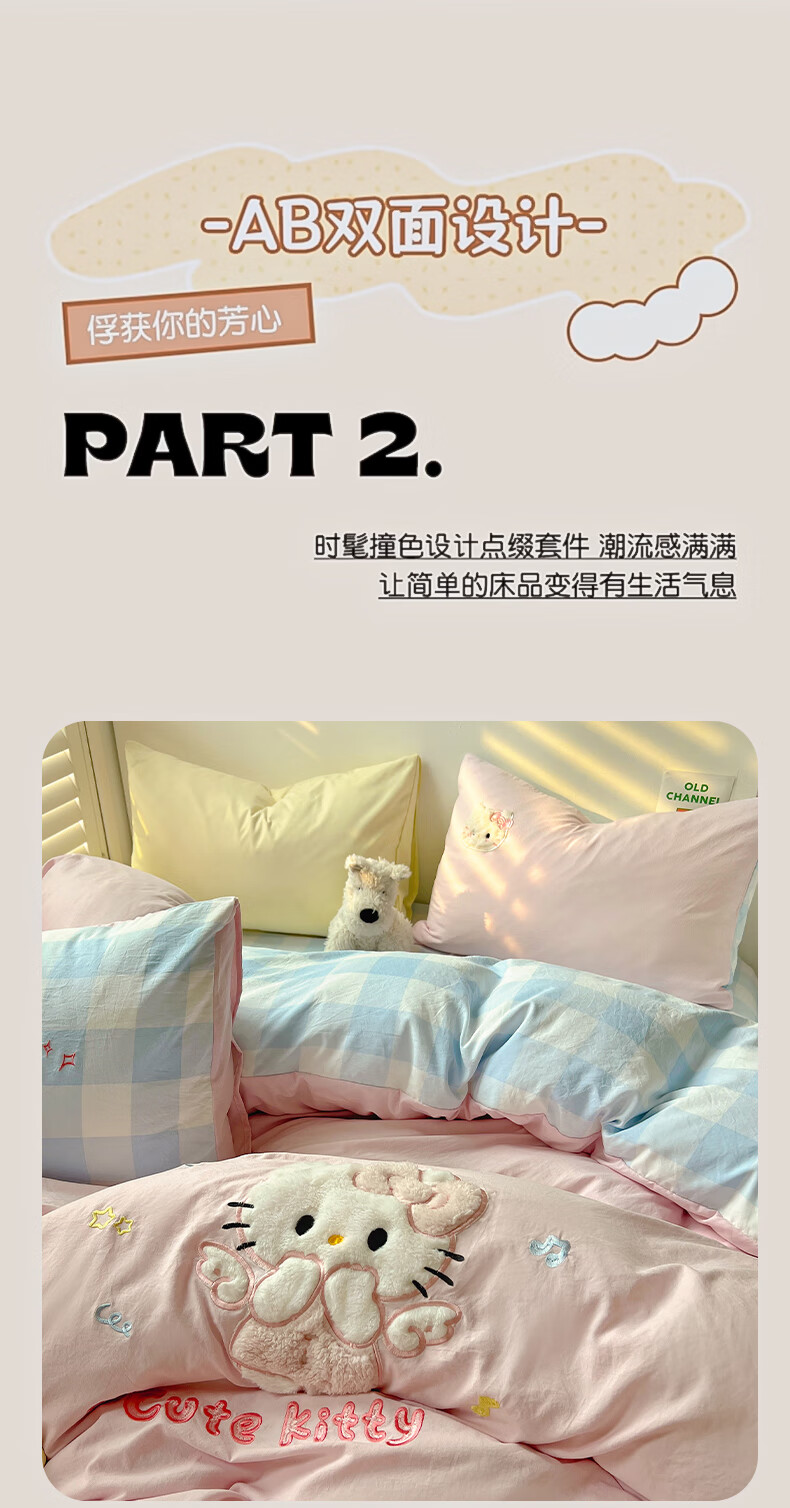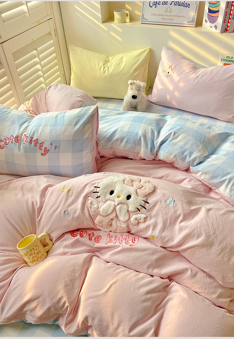 VJEA类可爱水洗棉贴布绣四件套公主风卡通床单被套学生宿舍三件套 天使喵喵-芭蕾粉+海岛蓝格 三件套0.9m 床单款 (被套150*200cm)