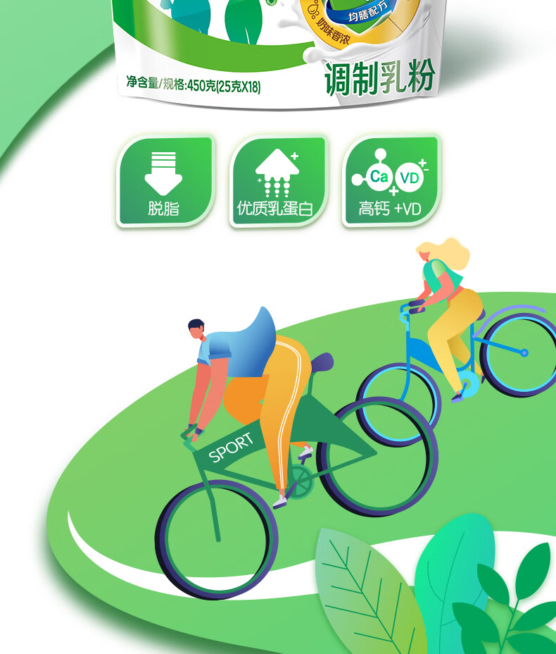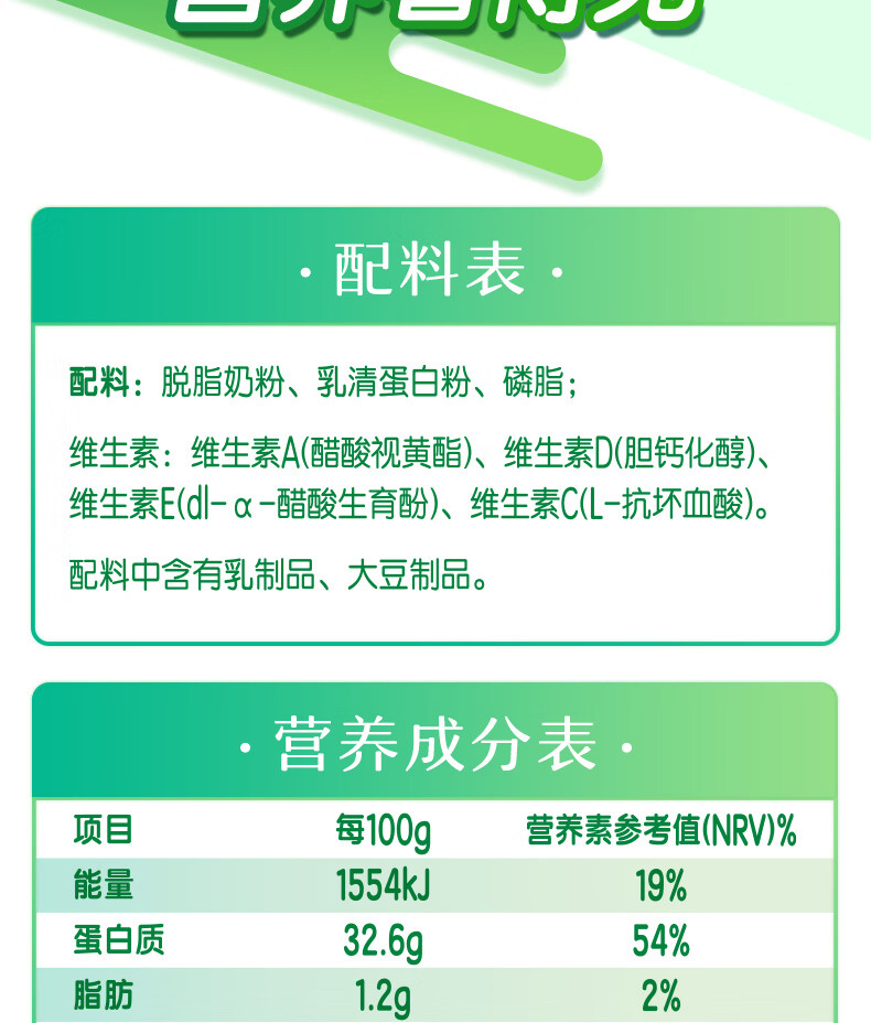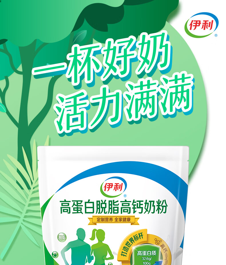 伊利高蛋白脱脂高钙奶粉450克袋装成人男女学生全家营养独立小袋