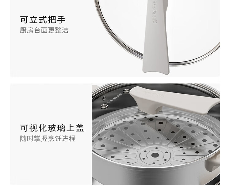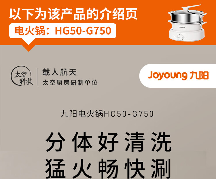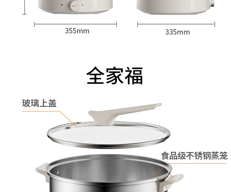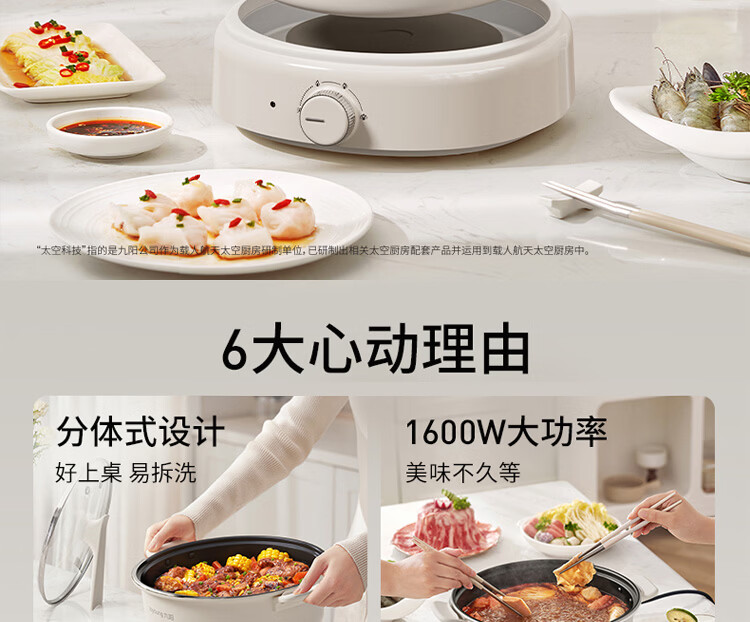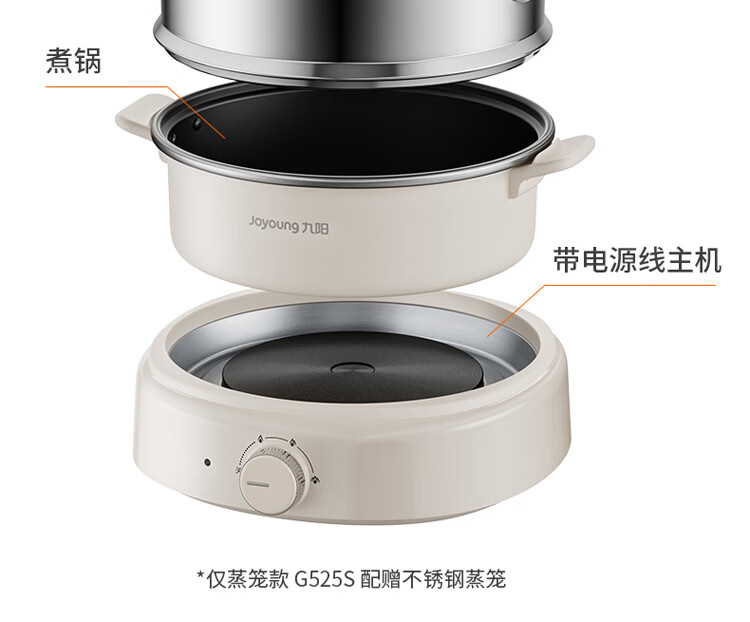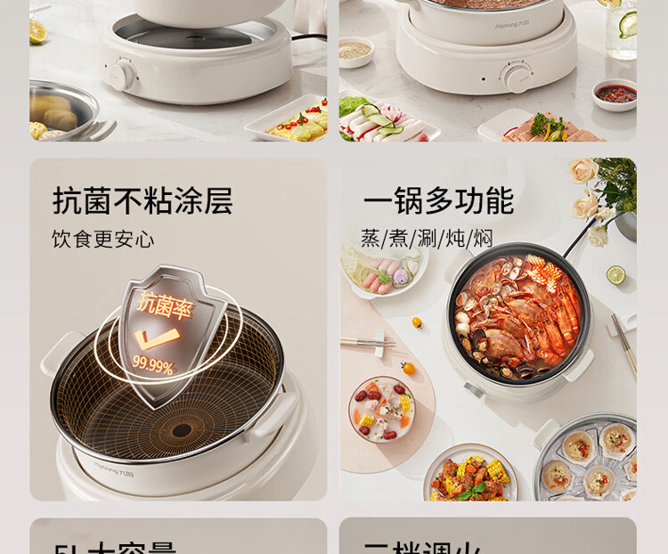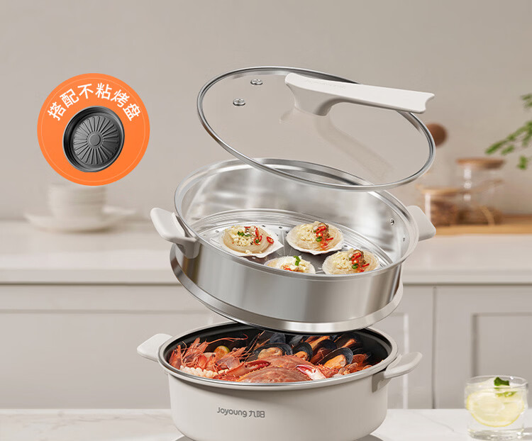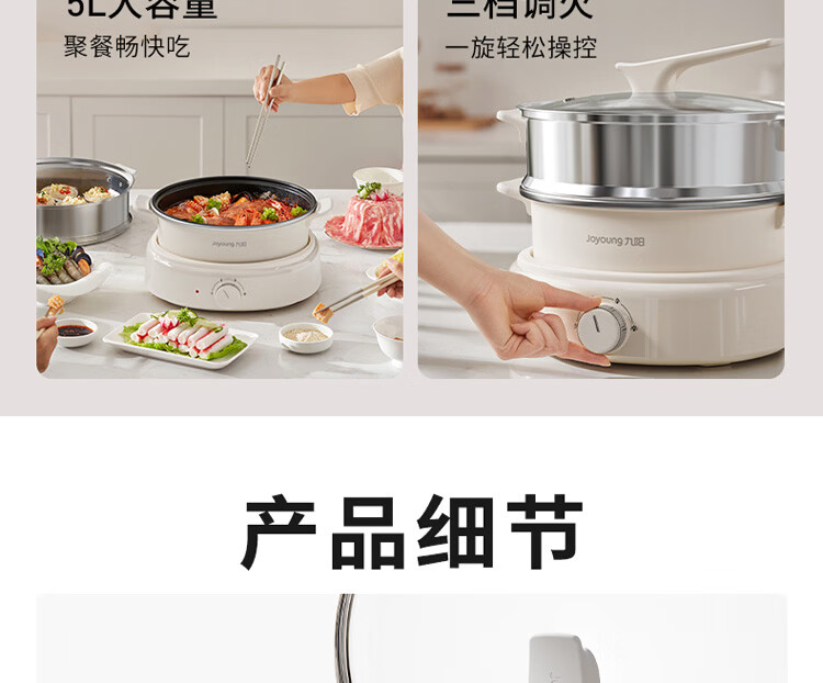 九阳电火锅分体式可拆洗家用大容量火锅专用锅电煮锅电炒锅多功能不粘锅 5L /奶茶色【配不锈钢蒸笼】