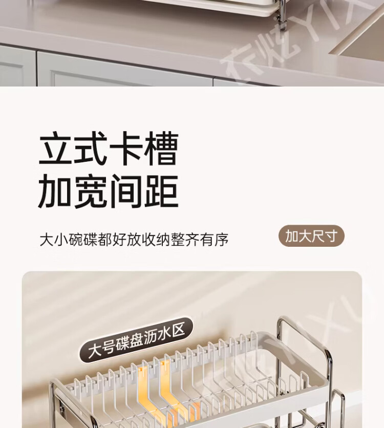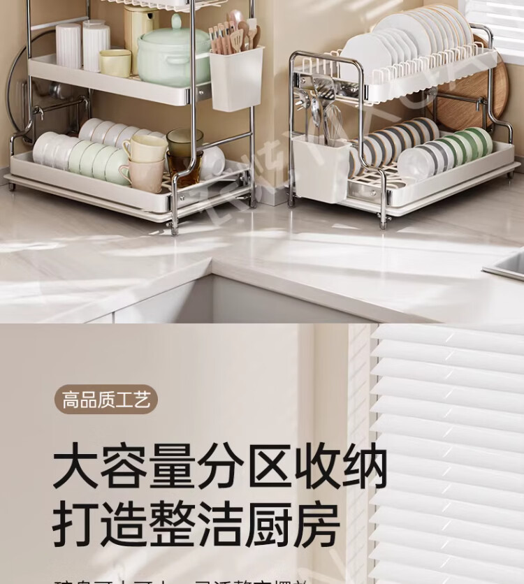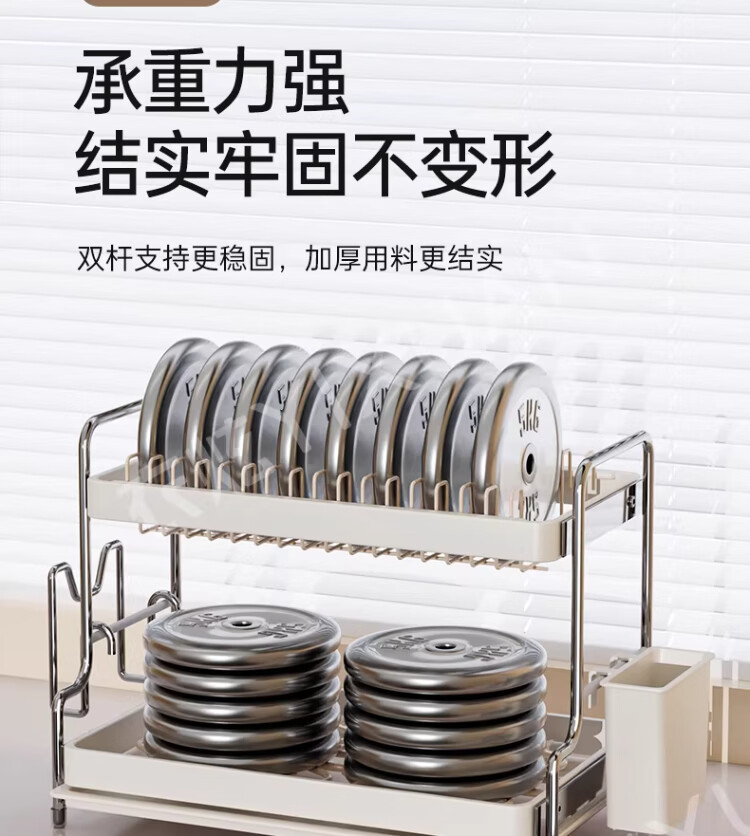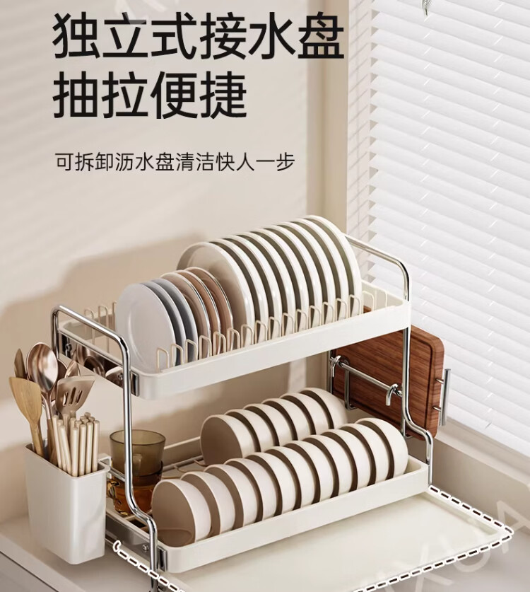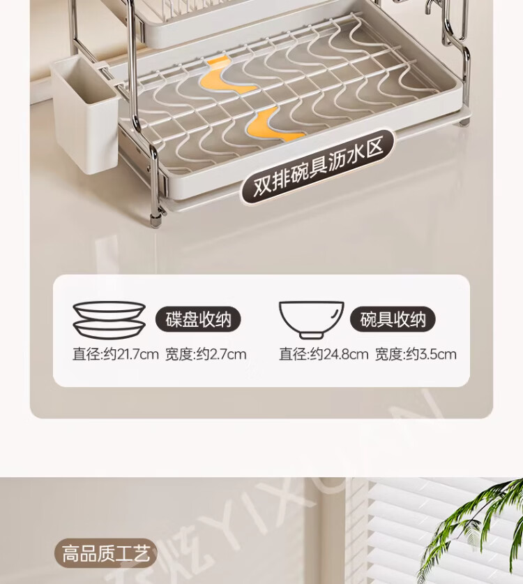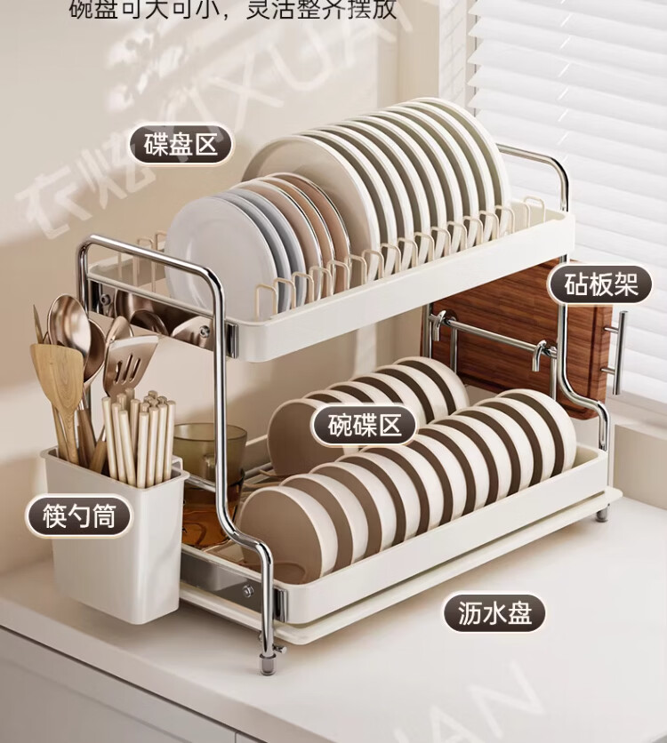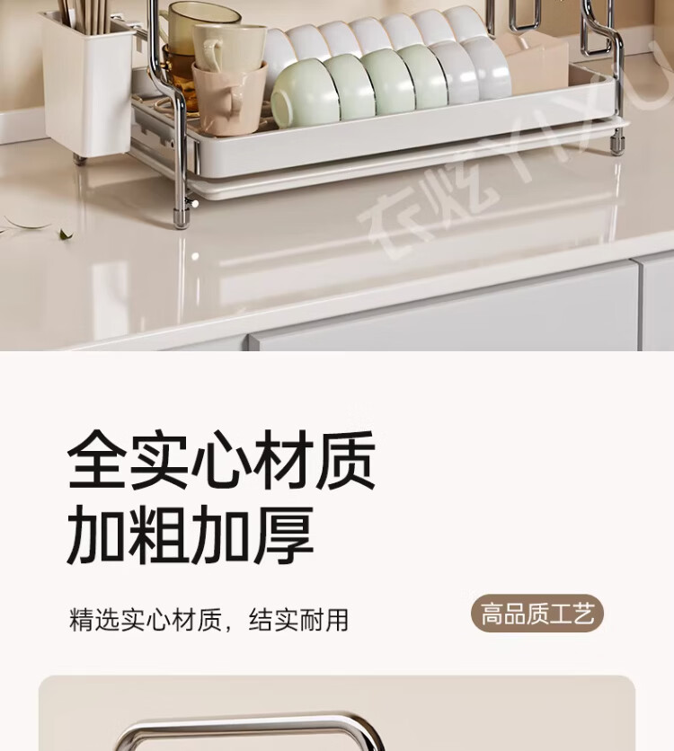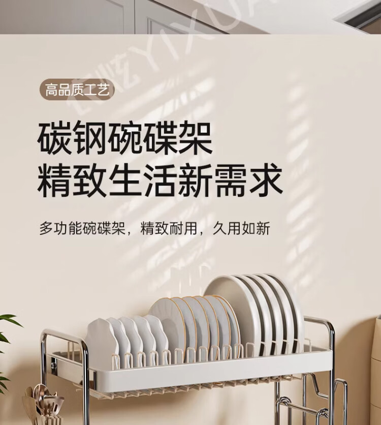 衣炫加厚碗碟收纳架沥水碗盘架厨房置物架家用筷子盒台面装餐具滤水篮 【实心碳钢】40cm双层碗碟沥水架 送筷筒+砧板架